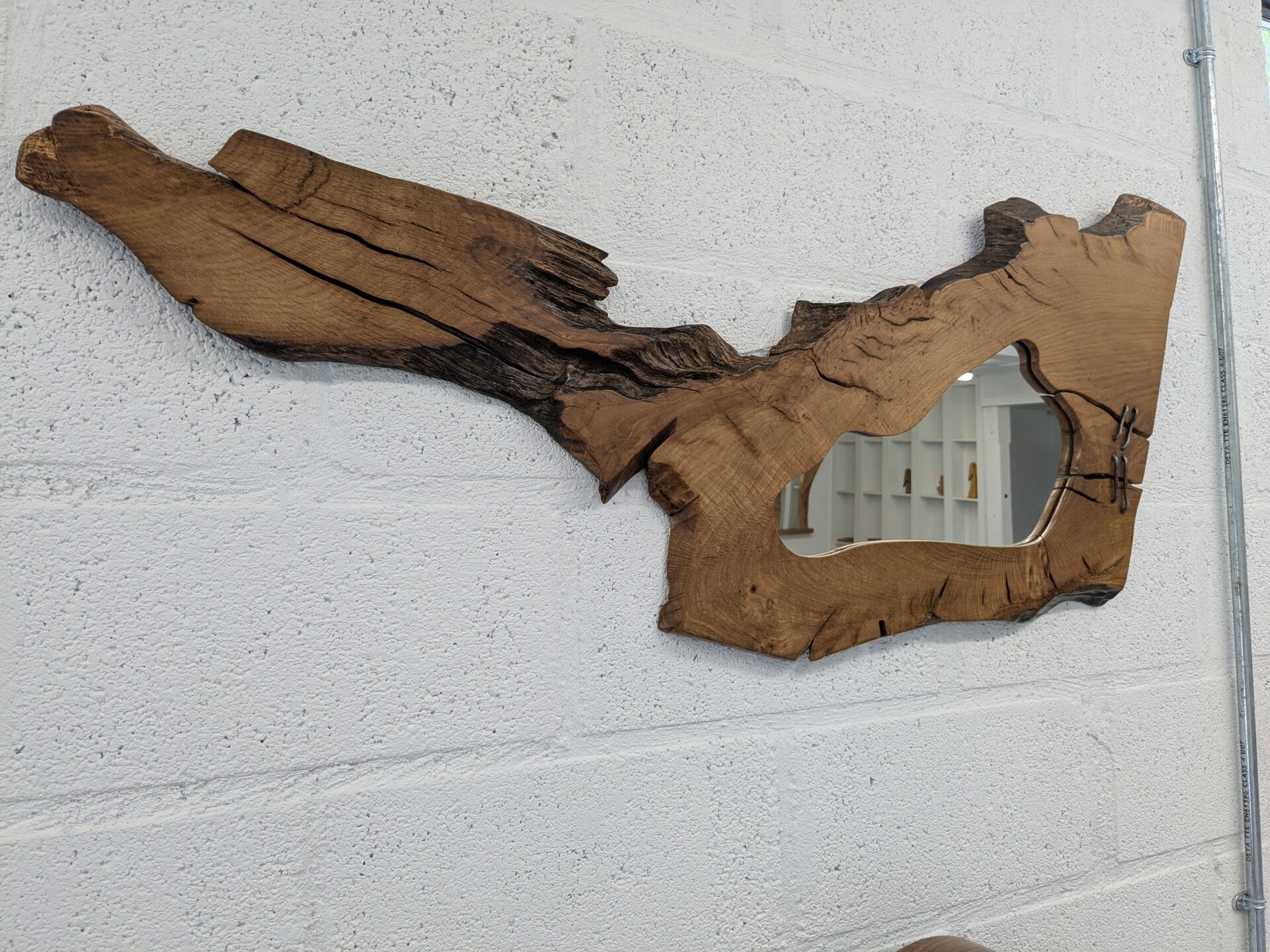 Made from a single piece of Irish Oak with a natural oil finish.Old nails used as stiches over the crack.